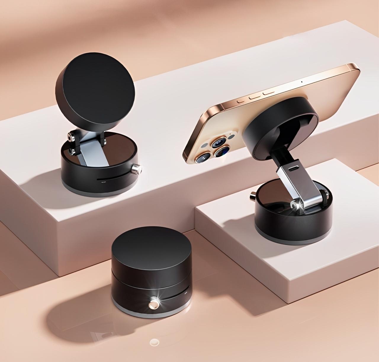Press the mechanical button once to activate the vacuum base, creating an airtight seal. The professional-grade double-row magnetic system instantly grabs and secures your device. Release with a single button press when you're ready to remove.