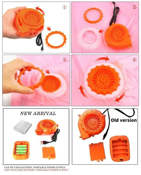 The costume includes a blower unit that circulates air continuously, helping maintain the inflated shape during use. Powered by 4 AA batteries (not included), the setup does not require external power, making it portable and adaptable for various environments. The built in fan system is integrated for convenience and speed.