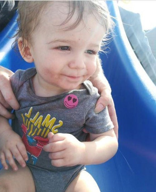 Designed to be placed on clothing, hats, bags, or strollers rather than on skin.