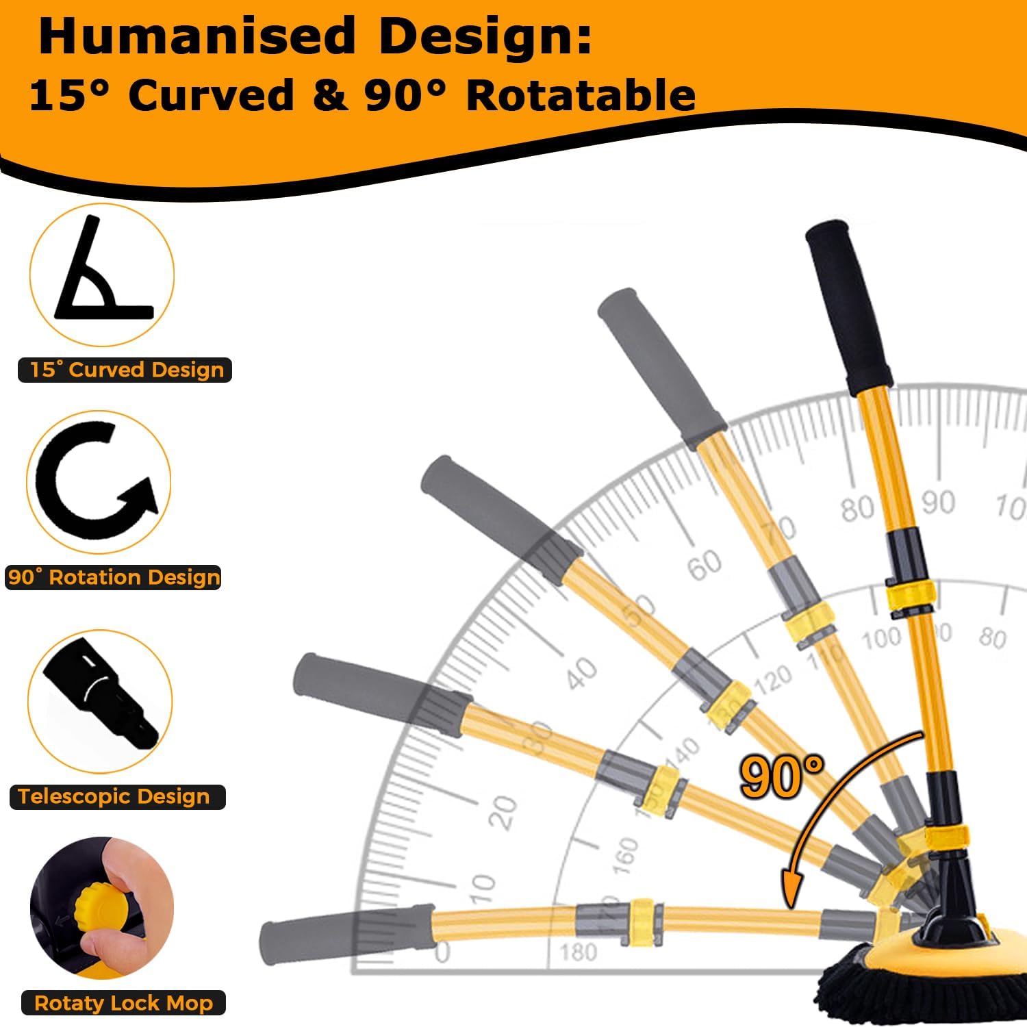 The brush features a 90° rotating head with an upgraded ABS lock system, reaching every angle effortlessly. Its 3-section telescopic pole adjusts from 50cm to 102cm, ensuring secure positioning. The aluminum alloy construction guarantees durability.